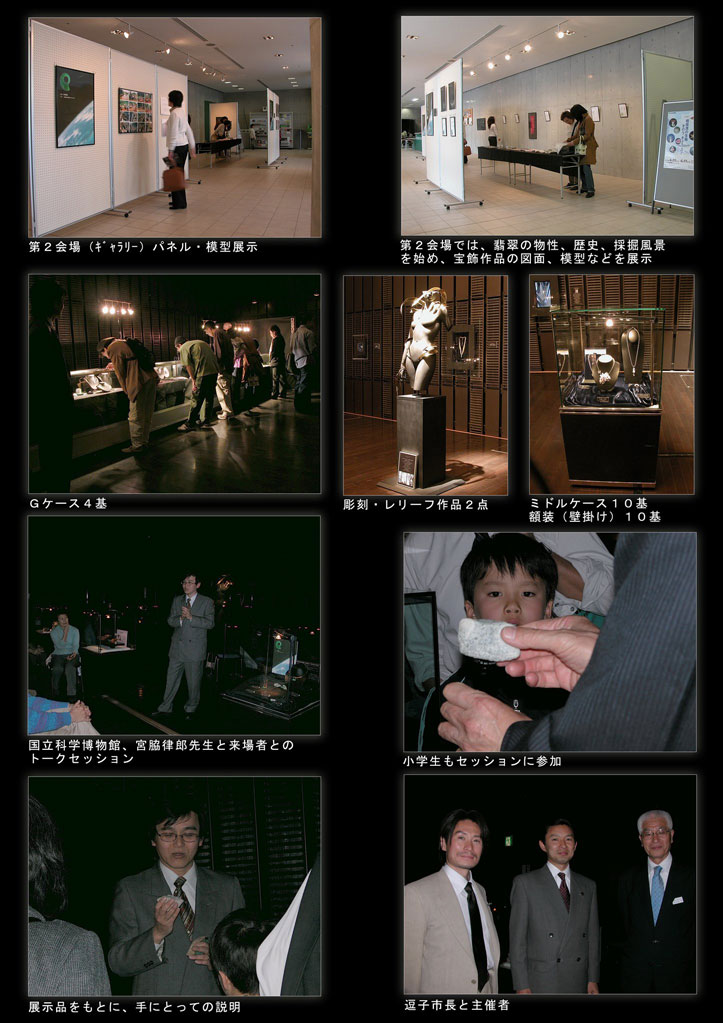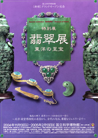 2004年、東京上野の国立科学博物館にて「翡翠展 東洋の至宝」が開催されました。翡翠の原石をはじめ、北京故宮博物院所蔵の「一級文物」(中国国宝に相当)から、現代の美術工芸まで、400点にのぼる翡翠を一同に集めた、世界で始めての総合展覧会でした。入場者数は約9万人。